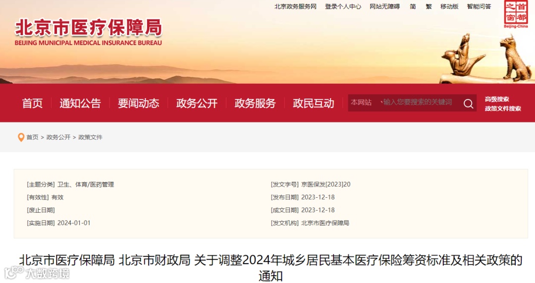 12月18日,北京市医疗保障局、北京市财政局发布《关于调整2024年城乡居民基本医疗保险筹资标准及相关政策的通知》。