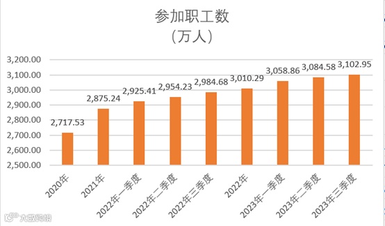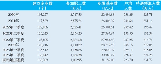 2023年11月29日,人力资源社会保障部官网发布《2023年三季度全国企业年金业务数据摘要》。截至2023年三季度,参加企业年金的企业数13.87万个、职工数3103万人,积累基金3.116万亿元,比去年同期分别增长10.26%、3.96%、11.96%。