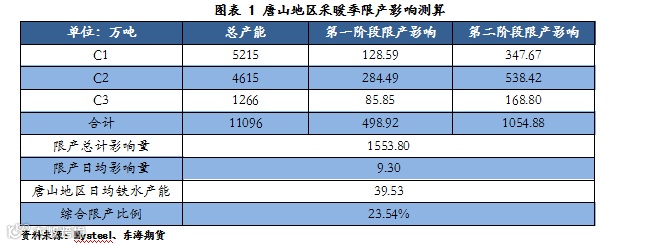 (1)唐山地区采暖季限产自11月15日已经开始,不过调研的主要钢厂均未收到政府的相关限产文件,企业普遍预计今年限产整体力度与去年相当,甚至可能松于去年。但同时也提到,若天气情况恶化,不排除阶段性限产趋严的可能。我们根据已经公布的政策文件和唐山地区相关的产能数据的算,今年整个采暖季期间综合限产比例约为24%,低于2018年31.55%的限产比例。限产层面后期应更多关注唐山地区空气质量变化情况。