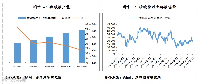 随着新能源汽车的发展突飞猛进,三元锂电池需求的爆发推动了硫酸镍的需求,未来电池用镍或将成为镍消费的第二大领域。今年来我国新能源汽车的产销量增速整体可观,中国汽车工业协会发布数据显示,1~10月,我国新能源汽车产销分别完成87.9万辆和86万辆,比上年同期分别增长70%和75.6%。但是受补贴政策退坡影响,增速已经有所放缓。