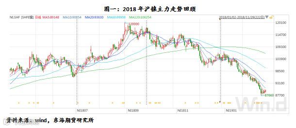 2018年,沪镍走势先扬后抑。上半年,镍价整体强势上涨,尤其是二季度以来镍价一飞冲天,于6月初达到120000元/吨的历史高位。但进入下半年,基本面逐渐走弱,叠加宏观扰动加剧,镍价破位下行,接连跌破10万、9万元/吨整数关口。