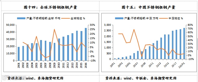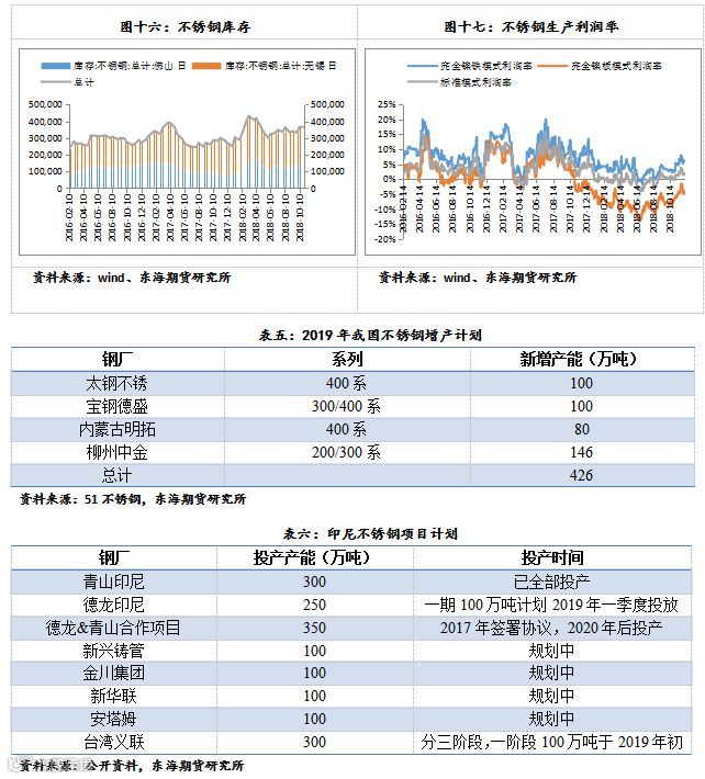 而不锈钢需求方面,终端消费领域仍然趋于疲弱,房地产呈下行态势,汽车和家电消费都呈负增长,新能源汽车产量的增速也有所放缓,基建领域尚无明显起色。在整体经济下行、消费疲弱的环境下,未来不锈钢产量的增加或将成为不锈钢的累库压力。此外,中美贸易摩擦依然具有很大不确定性,一旦形势恶化,一方面将拖累全球经济增速进而影响消费需求,另一方面部分不锈钢下游商品如厨具等亦会面临较大出口压力。