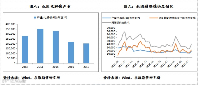 国内方面,据wind数据,2017年我国电解镍产量20.26万吨,同比下降7.9%。2016年我国电解镍产量21.99万吨,同比下降33.7%。2014年以来,镍铁生产不锈钢对电解镍的替代作用明显,电解镍产量持续下滑。据SMM,2018年1-10月我国电解镍累计产量11.92万吨,同比减少8.63%。