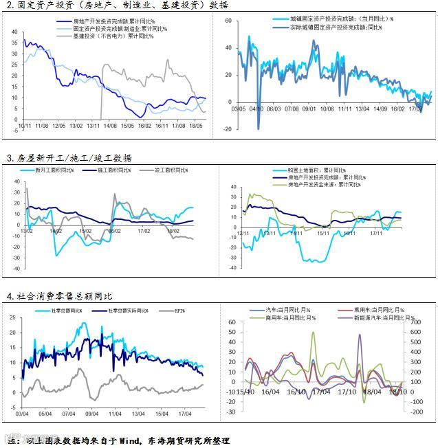 1、从需求端来看,年内固定资产投资增速将保持平稳,其中,11月房地产投资部分先行数据仍保持在高位,年内地产投资仍有韧性,赶工期过后明年下半年地产投资下行压力或显现;基建投资或继续小幅修复,但结合11月的信贷数据显示,实体经济融资需求偏弱,地方隐性负债增长仍受限制,基建或不具备大幅反弹的基础;11月消费数据疲弱,顺周期性逐步显现,但本身波动较小,伴随着经济下行趋势,及居民加杠杆导致居民负债规模扩张,消费仍将承压;受基数和中美贸易争端等因素的拖累,出口将承压。在生产端,11月环保限产政策边际趋松,但由于需求端疲弱,产品产量跌多涨少,生产端增速总体偏弱。结合11月制造业PMI指数显示,生产和需求的扩张速度继续放缓。整体来看,供需疲弱的格局延续,明年经济下行压力加大,工业品价格持续承压。
