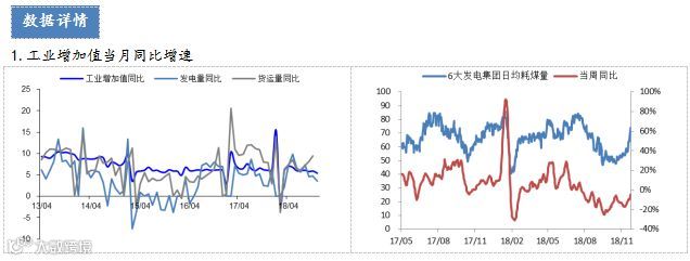 2、11月规模以上工业增加值同比5.4%,环比10月回落0.5个百分点。分三大门类看,制造业和采矿业增速的回落拖累工业增加值增速。11月份,采矿业增加值同比增长2.3%,增速较10月份回落1.5个百分点;制造业增长5.6%,回落 0.5个百分点;电力、热力、燃气及水生产和供应业增长9.8%,加快3.0个百分点。从产品产量来看,钢材和粗钢产量仍保持两位数增长,或受益于环保限产边际趋松,对基建明年回暖形成支撑;由于11月原油价格大跌,原油和化工品产量增速下降;水泥产量11月增速1.6%,较10月大幅下降11.5个百分点;汽车产量11月份同比-16.7%,增速连续5个月回落。从高频数据方面来看,11月发电量增速持续回落,6大发电集团耗煤量当月同比跌幅稍有收窄,虽然环保限产政策边际趋松,但由于需求端疲弱,生产端增速仍总体偏弱。