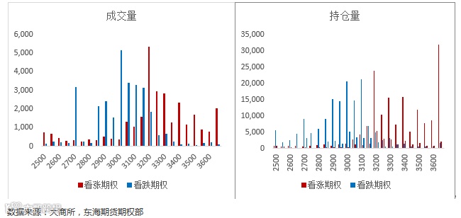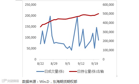 一般经验认为缴纳保证金的期权卖方属于资金优势者,通过分析卖方的持仓行权价来分析大资金倾向的压力位和支撑位。截止上周9.21,成交量多集中3000-3200,持仓量上,看涨期权集中在3200-3300,看跌期权集中在3000-3100附近。可以看出,目前市场比较认可的支撑和压力位置在3000-3100和3200-3300。