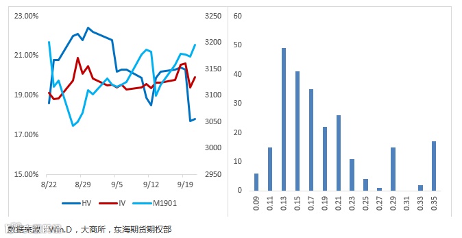 波动率为期权定价的关键因素,更是衡量期权价格高/低估的唯一指标。我们综合比较其和历史波动率的大小来预估商品期权定价。通过对豆粕主力近一年的历史波动率统计,其20日的波动率均值和中值分别为17.6%和15.8%,截止9.21,豆粕主力的IV和HV20分别为19.91%和17.8%,相比前周,HV和IV重心均有所下降,HV下降较多,从频率上看,处于频率区间的中枢水平,短期内期权波动率维持震荡的概率较大。