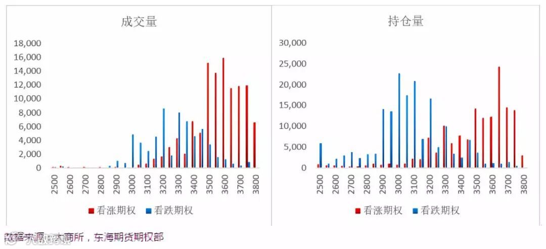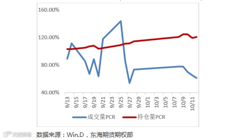 我们通常通过分析成交量和持仓量的PCR(看跌期权与看涨期权的比值)来衡量当前市场的情绪。上周成交量PCR重心稍下移,而持仓量PCR重心抬高,显示目前整体市场情绪较为看多。