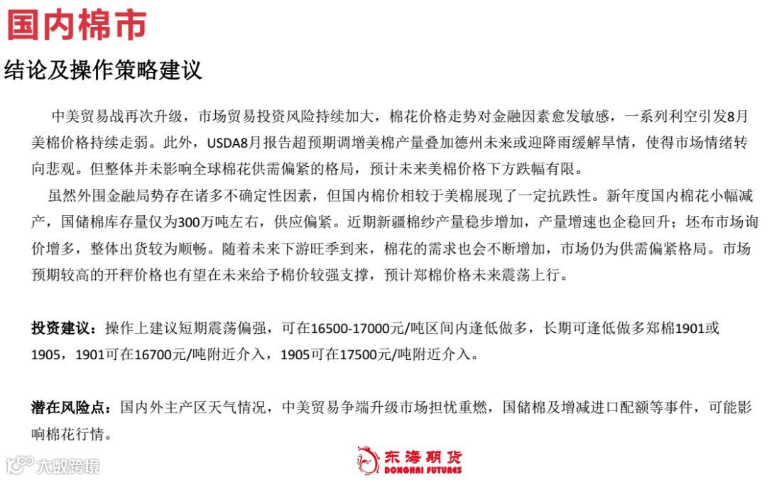 导读:郑棉9月月度投资策略:供需偏紧格局不改,预计郑棉震荡上行