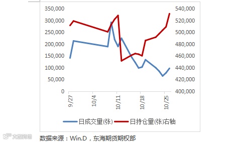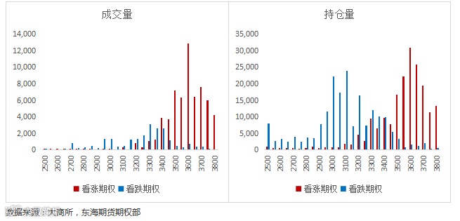 一般经验认为缴纳保证金的期权卖方属于资金优势者,通过分析卖方的持仓行权价来分析大资金倾向的压力位和支撑位。截止10.26,成交量多集中3600附近,持仓量上,看涨期权集中在3600附近,看跌期权集中在3100附近。目前资金面的压力位3600附近,支撑位还是在3100附近。