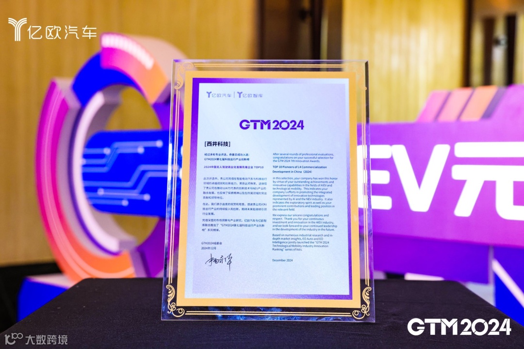 12月20日,由科技出行产业智库与创新服务平台亿欧汽车主办的GTM2024第七届科技出行大会暨科技出行产业创新榜发布会在上海圆满闭幕。西井科技凭借自身在无人驾驶商业化领域的技术创新能力、可持续迭代能力,成功入选“2024中国无人驾驶商业化发展先锋企业TOP10”榜单。