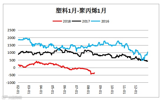 塑料聚丙烯价差(L1901– PP1901)震荡下行,未来行情有待观望。