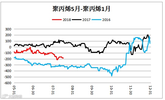 聚丙烯跨期价差(PP1905 – PP1901)震荡下行。