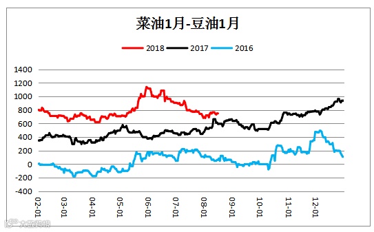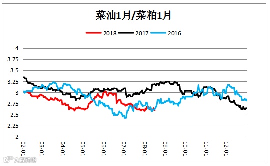 菜油菜粕价差(O1901– RM1901)价差震荡下行。