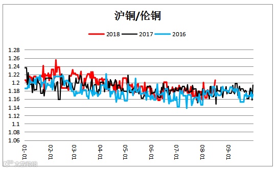 沪铜伦铜比(CU1810/LMES-铜3)区间震荡。