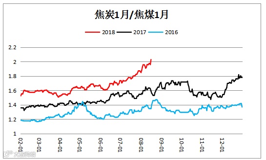焦炭焦煤价比(J1901/ JM1901)震荡上行,建议