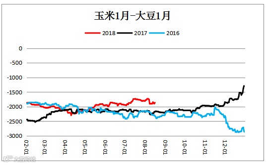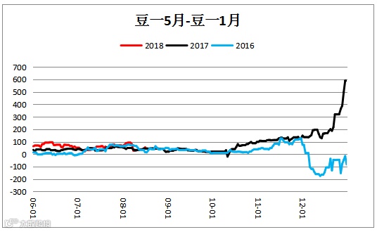 大豆跨期价差(A1905– A1901)小幅震荡。