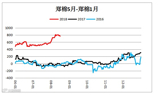 棉花跨期价差(CF1905– CF1901)震荡上行,未来行情有待观望。