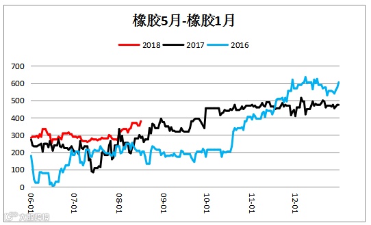 天然橡胶跨期价差(RU1905– RU1901)震荡上行。