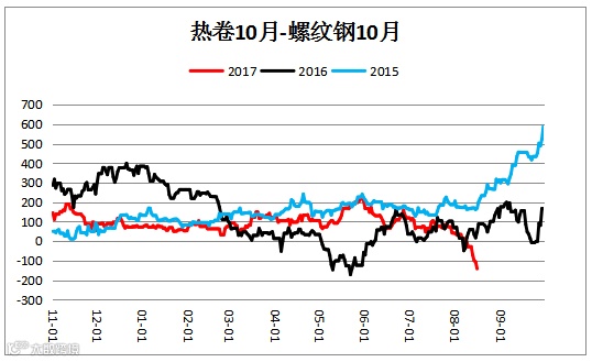 热卷螺纹钢价差(HC1810 – RB1810)震荡下行,建议观望。
