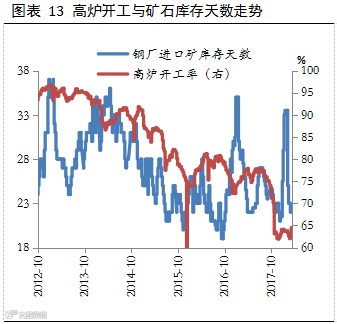 4、钢厂矿石库存处于22天低位,随着北方采暖季限产的结束,钢厂的复产势必会带动一波矿石的补库存需求。同时,考虑到普氏62%铁矿石指数已经跌至63美元/吨,铁矿1809合约最新收盘价为454.5元/吨,折合美元价在58美元/吨左右,加上铁矿石1809合约开始即执行新的交割标准,因此继续下跌空间有限。