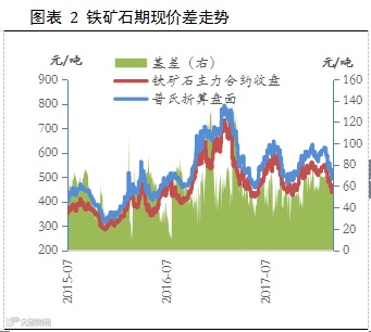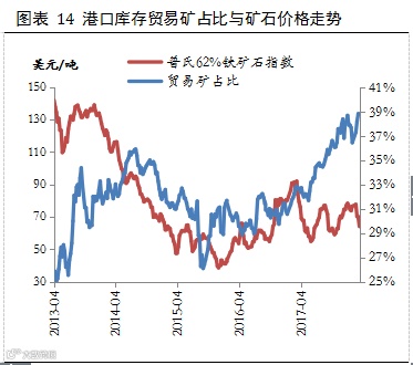 价格的下跌也刺激了贸易商的采购积极性,截止到上周末,矿石港口库存中贸易矿占比达到38.89%,较3月初回升1.59个百分点,自3月份以来,该比值连续4周回升。贸易商采购积极性的提升将进一步放大矿石的阶段性需求回升,对矿价行程一定支撑。因此,在成材价格企稳的情况下,铁矿石价格出现阶段性反弹的可能性较大。同时,考虑到普氏62%铁矿石指数已经跌至63美元/吨,铁矿1809合约最新收盘价为454.5元/吨,折合美元价在58美元/吨左右,加上铁矿石1809合约开始即执行新的交割标准,因此继续下跌空间有限。