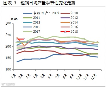 根据国家统计局公布的数据,今年1-2月份国内粗钢产量13681.7万吨,同比增长5.9%,日均产量更是创出231.9万吨的历史同期高位,表明北方采暖季限产情况不及市场预期。造成这种现象的主要原因是采暖季期间采用“限铁不限钢”的政策,钢厂可以通过在转炉环节增加废钢比例的方式增加产量,这一点从1-2月份生铁和粗钢产量的背离(前两个月生铁产量同比下降1.7%)以及去年12月份之后废钢价格的大幅上涨(累计涨幅最高达到33%)可以得到印证。