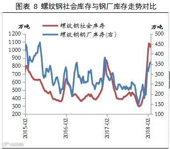 2、目前,钢材价格弱势下行,社会库存下降,行业大概率进入主动去库存阶段,整个去库存时间可能持续至6月,且未来几周降幅可能会进一步扩大。从库存结构上看,库存传导渠道不畅,社会库存降、钢厂库存增加,整个产业链库存呈现向上游转移趋势。因此,后期由去库存引发的价格反弹能否持续更多的取决于库存的下降速度以及库存结构的优化。不过,从近3周情况看,螺纹钢厂库呈现增幅逐渐收窄态势,应该说库存数据总体朝着利好方向发展。