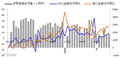 2、在进口方面,8月份进口增速按人民币计价为18.8%,按美元计价为17.7%,平稳回落但仍高于预期。从主要进口商品来看,进口量增速涨跌不一,进口价格因素支撑仍在。8月原油、钢材、大豆进口量增速较7月回升9.3、2.4、28.8个百分点至13%、7.5%、8.3%。或担心受中美贸易影响导致大豆价格在第四季度上涨,买家提前买入大豆。8月未锻造的铜及铜材、铁矿砂、煤及褐煤进口量增速较7月下滑7.7、3.5、35.6个百分点至7.7%、0.8%、13.5%。在进口金额方面,8月原油、钢材、大豆进口额增速较7月回升11.4、3.3、27.6个百分点至74.4%、12.7%、15.7%。8月未锻造的铜及铜材、铁矿砂、煤及褐煤进口额增速较7月下滑19.8、13.1、36.5个百分点至11.8%、6.6%、36.2%。另外,8月份全国高炉开工66.5%,较上月70.2%有一定程度的下降。8月发电耗煤增速由正转负,唐山钢厂产能利用率继续下行,全国高炉开工率维持低位,汽车、化工行业开工率下滑,均指向供需增速有所放缓。