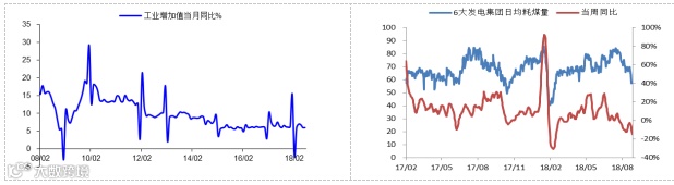 2、8月规模以上工业增加值同比6.1%,微升0.1个百分点,仍处于低位徘徊,主要行业增速涨少跌多。分三大门类看,8月份,采矿业增加值同比增长2.0%,增速较7月份加快0.7个百分点;制造业增长6.1%,回落 0.1个百分点;电力、热力、燃气及水生产和供应业增长9.9%,加快0.9个百分点。8月工业增加值略升,一方面由于前期基数较低,另一方面或受贸易战影响出现提前备货。从高频数据方面来看,8月发电耗煤增速由正转负,工业生产整体偏弱。8月六大集团发电耗煤同比增速逐旬走低, 8月底同比增速降至-12.2%,创下3月以来周度增速新低,而环比增速-7.5%,也降至历史同期新低。而8月发电量同比增速从7月的5.7%加快至7.3% ,与高频数据中的日均耗煤量出现背离,或因8月水力发电增速上升,且内陆省份用电量高于沿海地区。另一方面,8月唐山钢厂产能利用率继续下行,全国高炉开工率维持低位,汽车、化工行业开工率下滑,均指向工业生产趋弱。