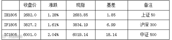 周一,三大股指全面反弹,其中IC收涨2.04%,相对强势,IF收涨1.61%、IH收跌1.28%,均有不俗表现。期现价差方面,按收盘价计,IC1805贴水缩小至18点左右,IF1805贴水缩小至7点左右,IH1805贴水缩小至2点左右。现指方面,权重与题材齐飞,受涨价提振,白酒、造纸股全面爆发,能源股集体上扬,医药、计算机等前期强势题材获得延续,化工板块迎来回暖,次新股午后发力。持仓方面,三大期指持仓中IH增持300手左右,IF、IC增持200手左右。