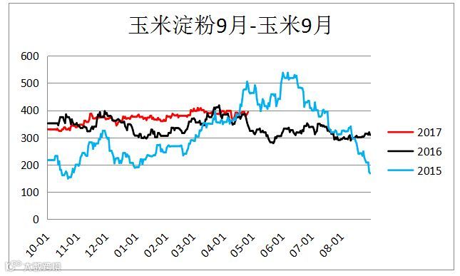 玉米淀粉玉米价差(CS1809 – C1809)小幅上行,建议观望。