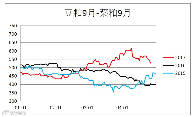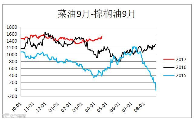 菜油棕榈油价差(OI1809 – P1809),菜油豆油(OI1809 – Y1809)价差震荡,建议观望。