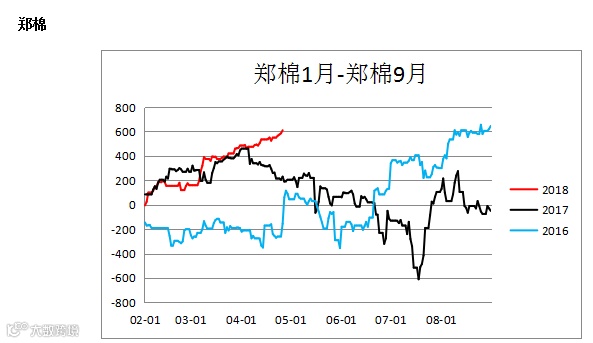 棉花跨期价差(CF1901– CF1809)震荡上行,未来行情有待观望。