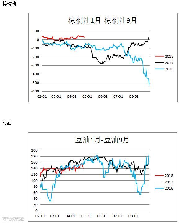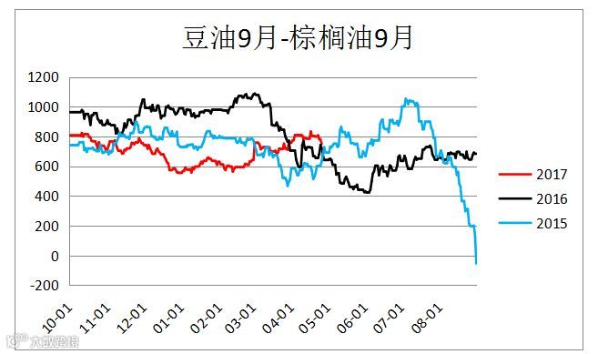 豆油棕榈油价差(Y1809– P1809)区间震荡,建议观望。