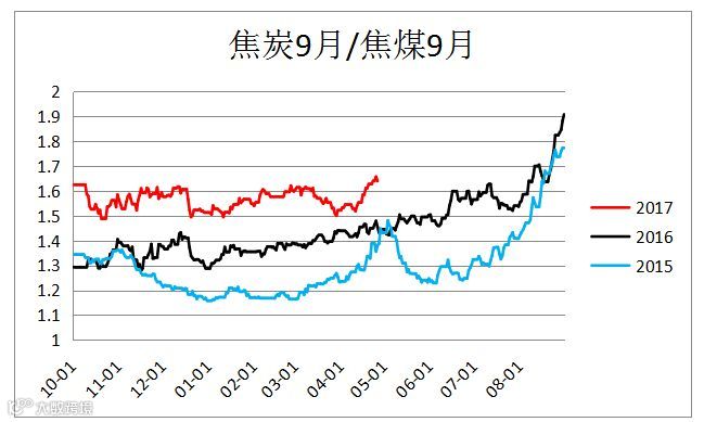 焦炭焦煤价比(J1809/ JM1809)震荡上行,建议观望。