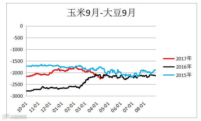 玉米大豆价差(C09M-A09M)区间震荡,建议观望。
