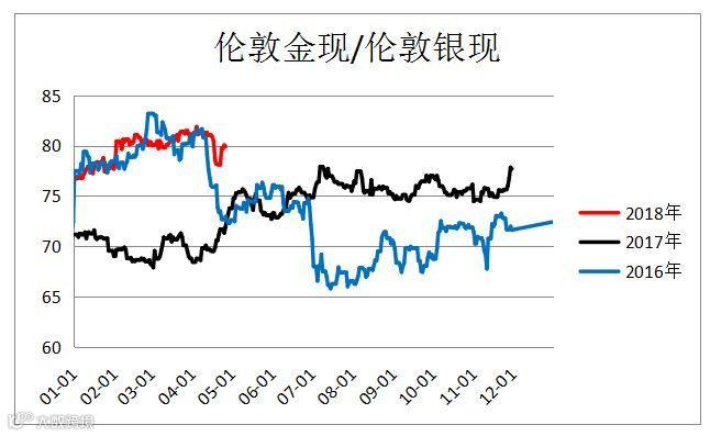 伦敦金银价比,沪金沪银价比(AU1806 / AG1806)区间震荡,未来行情有待观望。
