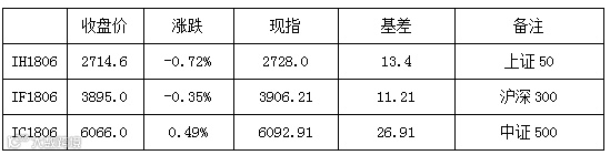 周二,三大股指走势分化,其中IC收涨0.49%,相对强势,IF收跌0.35%、IH收跌0.72%,均显弱势。期现价差方面,按收盘价计,IC1806贴水缩小至27点左右,IF1806贴水缩小至11点左右,IH1806贴水扩大至13点左右。现指方面,美或撤销对中兴销售禁令,5G概念提振上攻,雄安新区总体规划最晚于6月份上交中央,概念股冲高,二胎概念表现活跃,医药股再度闪耀,地产、家电、保险依旧表现不佳。持仓方面,IF减持300手左右,IC减持600手左右,IH增持300手左右。