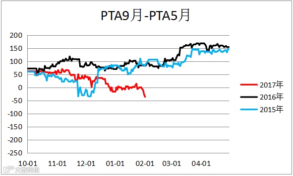 PTA跨期价差(TA1809 – TA1805)价差震荡下行,建议观望。