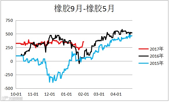 天然橡胶跨期价差(RU1809– RU1805)反弹。
