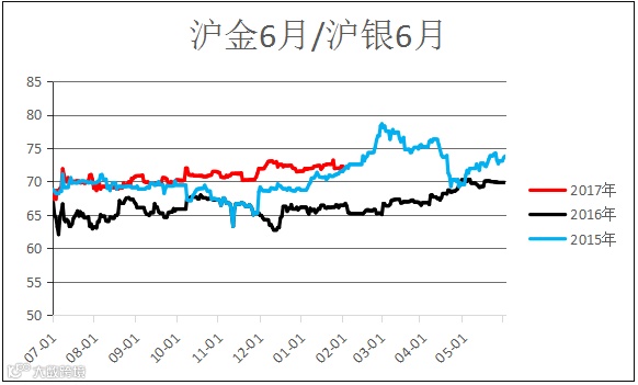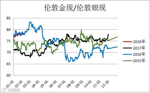 伦敦金银价比,沪金沪银价比(AU1806 / AG1806)区间震荡,未来行情有待观望。