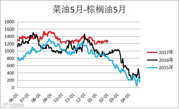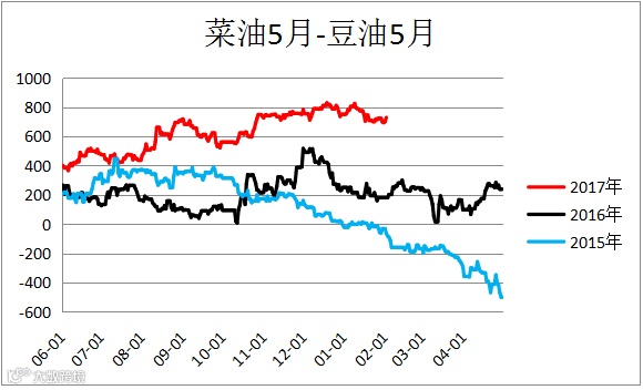 菜油棕榈油价差(OI1805 – P1805),菜油豆油(OI1805 – Y1805)价差震荡,建议观望。