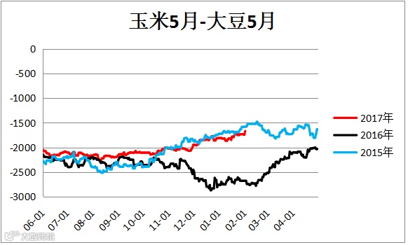 3、 玉米大豆价差震荡偏强,供给侧改革之后,玉米播种面积减少而大豆播种面积增加,建议进行多玉米空大豆的套利操作。