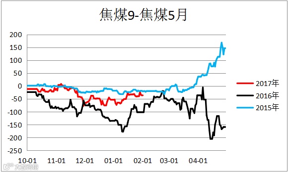 焦煤跨期价差(JM1809 – JM1805)震荡偏弱,焦炭跨期价差(J1809 – J1805)小幅震荡,建议观望。