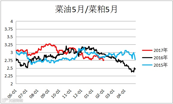 2、 油粕比震荡,1月份市场整体上呈现外强内弱,粕强油弱的格局,油脂基本面压力始终没有得到有效缓解,建议进行买粕抛油的套利操作。