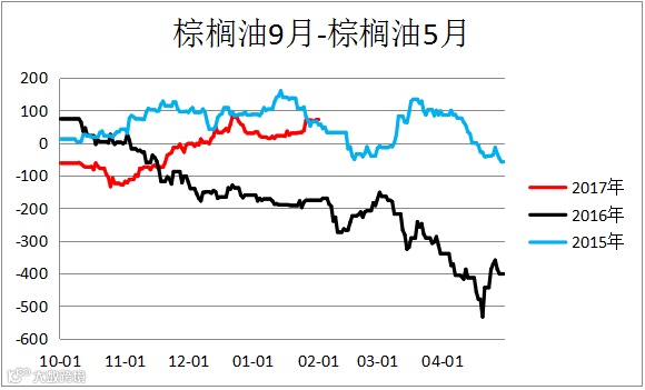 棕榈油跨期价差(P1809 – P1805)小幅上行。豆油跨期价差(Y1809– Y1805)区间震荡。