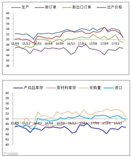 2、2月需求跌幅扩大,生产也出现较大幅度回落。在需求方面,新订单指数录得51.0,环比回落1.6个百分点;新出口订单录得49.0,环比回落0.5个百分点,连续2月位于荣枯线以下。2月生产指数分项录得50.7,环比大幅回落2.8个百分点。总体看,反映需求状况的分项都出现回落,其中新订单指数和新出口订单指数都有所下行,一方面受到春节停工影响较大,另一方面,整体需求仍面临一定的下行压力。在生产方面,取暖季环保限产使得工业生产降温。在边际上需关注3月15日环保限产逐步结束后对经济活动和经济数据的影响。上游行业的价格及利润将回归常态增长,来自价格因素改善对经济支撑的可持续性有待观察。