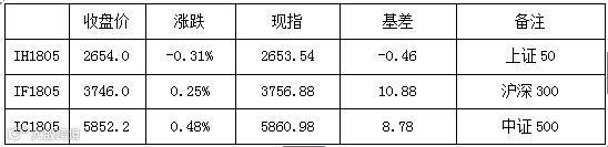 上周五,三大股指全天震荡,多空争夺激烈,其中IC收涨0.48%,IH收跌0.46%,IF收涨0.25%。期现价差方面,按收盘价计,IC1805贴水缩小至9点左右,IF1805贴水缩小至11点左右,IH1805基本保持平水。现指方面,当日最受伤的当属白马蓝筹股,业绩向好叠加政策催化,医疗医药板块倍受避险资金青睐,海南板块造好,沪港通、深港通概念股大跌。持仓方面,三大期指持仓均小幅增减,无太大变化。