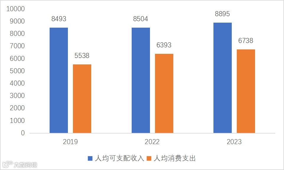 人均消费支出较2019年同期增长21.7%至6,738元,其中服务性消费支出增长较快,显示出被压抑的需求释放、消费信心显著改善。